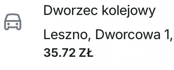 33. Dodane przez do kom. 20, w dniu - 12-09-2025 21:31 63 6-7 zł za kurs? Widocznie musiałem mieć pecha, bo dwa razy zamówiłem Bolta w Lesznie i wcale nie były to tak tanie przejazdy. Co mnie mocno zawiodło zresztą. Załączam fragment zrzutu ekranu za sierpniowy przejazd z Narutowicza na PKP - 35,72 zł. W Warszawie za znacznie dłuższe przejazdy płaciłem mniej.