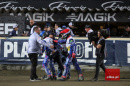 Bydgoszczanie zaczęli lepiej "czytać" tor i łapali wiatr w żagle, ale nie był to powrót na miarę tego, co w Bydgoszczy zrobili leszczynianie. W dwunastej gonitwie Łoktajew z Andrzejewskim zdobyli 4 punkty i Polonia zmniejszyła stratę do Unii do ośmiu „oczek”. Na więcej Byki już jednak nie pozwoliły. W trzynastej odsłonie krajowi liderzy Fogo Unii - Janusz Kołodziej i Grzegorz Zengota - postawili kropkę nad „i”. Kapitan po wygranym starcie mknął po 3 punkty, a Zengota, choć po zamieszaniu na pierwszym łuku jechał na końcu stawki, walczył do końca i minął Huckenbecka. Wygrana 4:2 oznaczała jedno - upragniony awans do Ekstraligi. Smoczyk był w euforii, a Kołodziej i Zengota nie mogli sobie odmówić przyjemności wskoczenia na bandę i świętowania sukcesu z kibicami.