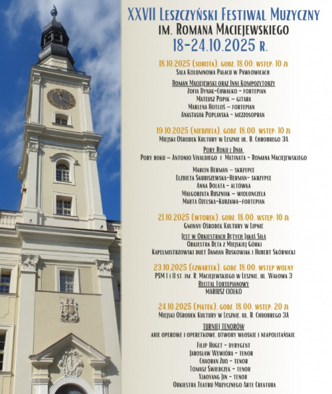 Dyżurny reporter: ![]() - To już prawie trzy dekady, odkąd zapraszamy melomanów na Leszczyński Festiwal Muzyczny. W tym roku nie tylko muzyka klasyczna - będzie też rozrywkowa, filmowa, a nawet marszowa - mówi Grzegorz Herman, dyrektor Miejskiego Ośrodka Kultury w Lesznie, który współorganizuje wydarzenie. Inauguracyjny koncert odbędzie się w Pałacu w Pawłowicach, gdzie w sobotę 18 października zabrzmią utwory m.in. Romana Maciejewskiego, Fryderyka Chopina i Jana Sebastiana Bacha. Dzień później, 19 października, w Miejskim Ośrodku Kultury w Lesznie publiczność usłyszy „Pory roku i dnia” - koncert połączony z ilustracjami wizualnymi. Festiwal zawita również do Lipna - 21 października tamtejszy Gminny Ośrodek Kultury zaprasza na koncert orkiestry dętej pod hasłem „Jest w orkiestrach dętych jakaś siła”. Dwa dni później, 23 października, odbędzie się recital fortepianowy Mariusza Ciołko - to jedyny koncert z bezpłatnym wstępem. W programie m.in. Paderewski, Szymanowski, Chopin i oczywiście Roman Maciejewski. Finałem będzie efektowny „Turniej Tenorów”, zaplanowany na 24 października w MOK-u. Usłyszymy wtedy znane arie operowe, operetkowe oraz piosenki włoskie i neapolitańskie. - To tydzień pełen muzycznych emocji, rozciągający się na kilka miejscowości i prezentujący bardzo różnorodny repertuar. Wszystko to w hołdzie dla Romana Maciejewskiego, związanego z Lesznem wybitnego kompozytora - podkreśla Grzegorz Herman. Festiwal organizowany jest przez Leszczyńskie Towarzystwo Muzyczne im. Romana Maciejewskiego. Współorganizatorami są Miejski Ośrodek Kultury w Lesznie, Pałac Pawłowice, GOK Lipno oraz Państwowa Szkoła Muzyczna w Lesznie. Wstęp na większość koncertów jest biletowany - bilety-cegiełki w cenie 10 i 20 zł można kupić m.in. w kasie MOK oraz przed wydarzeniami.