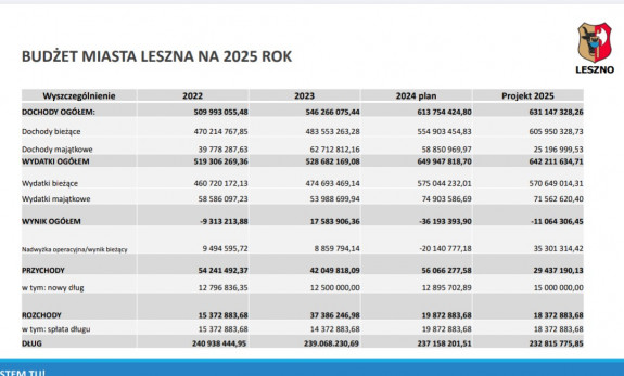 Projekt budżetu miasta Leszna na rok 2025 został zatwierdzony Zarządzeniem Nr 31/11/2024 Prezydenta Miasta Leszna z dnia 15 listopada 2024r. i zakłada: