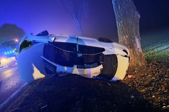 wjechał na pobocze, stracił panowanie nad autem, wypadł z drogi, uderzył w drzewo i dachował. Samochód zatrzymał się na boku.
