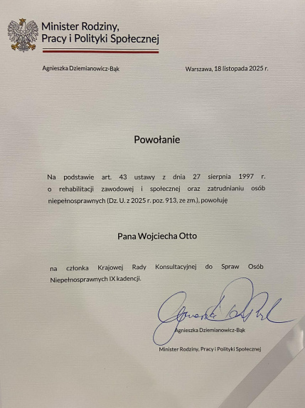 Dyżurny reporter: Otto nie ukrywa, że nominacja jest dla niego zarówno powodem do satysfakcji, jak i dużym zobowiązaniem. - Oczywiście jest to dla mnie ogromne wyróżnienie, ale przede wszystkim ogromna odpowiedzialność, ponieważ Krajowa Rada Konsultacyjna jest ciałem doradczym pełnomocnika 667 70 70 60 rządu do spraw osób niepełnosprawnych. To właśnie z tą radą pełnomocnik konsultuje wszystkie najważniejsze decyzje i przyszłe ustawy, które mają być procedowane - mówi. Jak dodaje, rada będzie miała realny wpływ na kierunek zmian w polityce dotyczącej osób z niepełnosprawnościami. - Jesteśmy istotnym ciałem opiniotwórczym, które będzie decydować o przyszłości i statusie osób niepełnosprawnych w Polsce. A zmian jest sporo - wdrażane są nowe ustawy, m.in. ustawa o asystencji osobistej osób niepełnosprawnych. Już w styczniu będziemy tworzyć zespoły robocze dotyczące właśnie asystencji oraz standaryzacji warsztatów terapii zajęciowej, co jest mi szczególnie bliskie - podkreśla. WTZ w Zaborowie oraz stowarzyszenie, którym kieruje Otto, od lat działają na rzecz dorosłych osób z niepełnosprawnościami w regionie. Teraz ich przedstawiciel będzie mieć wpływ również na rozwiązania w skali kraju. - Jesteśmy dumni, że możemy współpracować z osobą, która swoją wiedzą, energią i sercem codziennie wspiera uczestników naszego Warsztatu i ich rodziny - czytamy na profilu społecznościowym warsztatów.