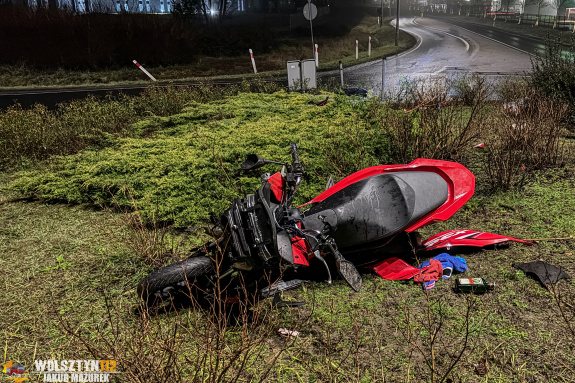 Na rondzie w Karpicku, znajdującym się w ciągu drogi krajowej nr 32, kierujący motocyklem zamiast prawidłowo pokonać skrzyżowanie, pojechał na wprost i uderzył w wysepkę. Motocykl jest uszkodzony, a obaj mężczyźni zostali przewiezieni do szpitala w Wolsztynie.