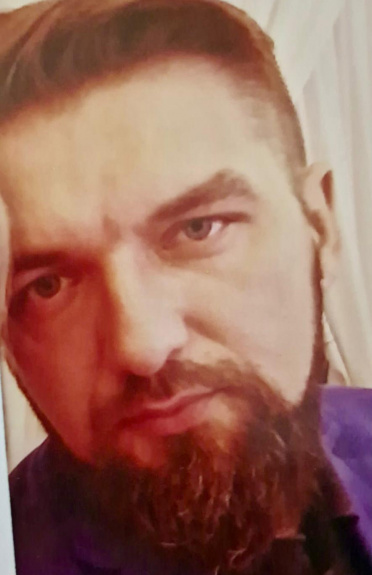 Wzrost 180 cm, włosy krótkie ciemne, zarost w postaci brody. Mężczyzna ma na sobie ubrania w czarnym kolorze.