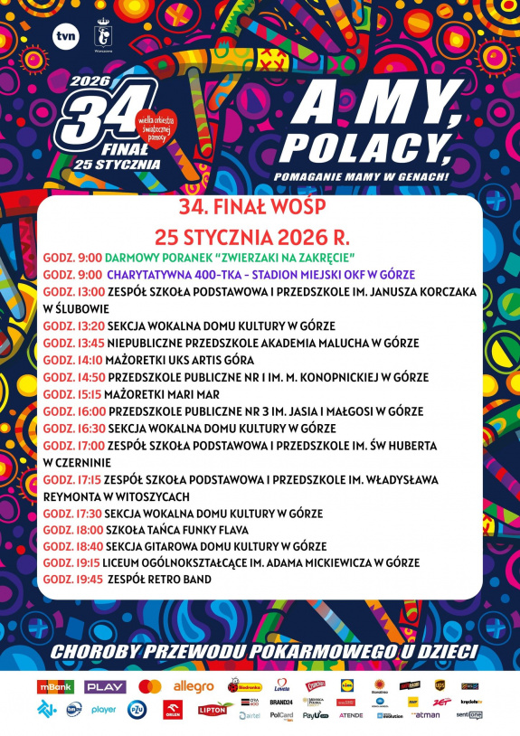 W Górze po raz kolejny odbędzie się 34. Finał Wielkiej Orkiestry Świątecznej Pomocy. Tegoroczne spotkanie przebiega pod hasłem „Zdrowe brzuszki naszych dzieci”, zbiórka prowadzona będzie na rzecz dzieci z chorobami przewodu pokarmowego.