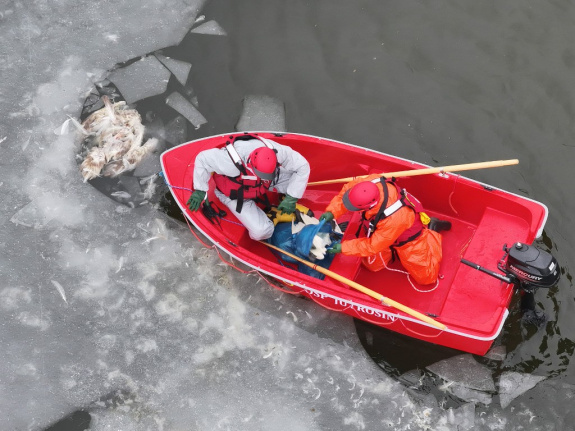 z lodu. Wykorzystywano łódź ratowniczą, sanie lodowe oraz bezzałogowy statek powietrzny. Działania trwały ponad trzy godziny. Na miejscu obecni byli także przedstawiciele Państwowego Gospodarstwa Wodnego Wody Polskie oraz Społecznej Straży Rybackiej. Zebrane ptaki zostały zabezpieczone przez weterynarię. Jak wynika z wcześniejszych doniesień, badania laboratoryjne potwierdziły obecność wysoce zjadliwej grypy ptaków podtypu H5. Choroba została stwierdzona u padłych łabędzi znalezionych wcześniej.