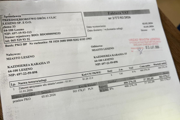 Prezydent Rusiecki na swoim profilu facebookowym zamieścił zdjęcie faktury za zimowe utrzymanie dróg w Lesznie w styczniu. Wynika z niej, że miasto zapłaci za styczeń Przedsiębiorstwu