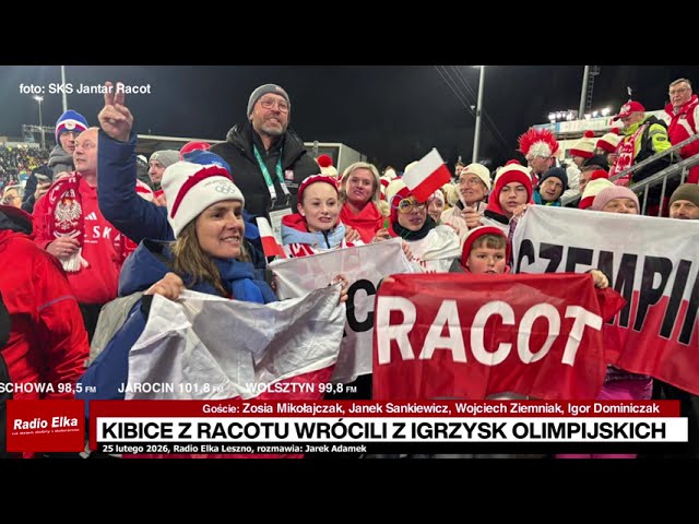 w ogóle, to 57 - powiedział senator Ziemniak. Do Mediolanu i Cortiny łącznie pojechało 80 osób, w dwóch ośmiodniowych turach. W Radiu Elka o swoich wrażeniach opowiadali Zosia, Janek i Igor. Wszyscy wzięli udział w zawodach w skokach narciarskich, czyli najbardziej polskiej dyscyplinie. -W sumie na cztery medale dla Polski w 50 procentach mieliśmy okazję kibicować - stwierdził Wojciech Ziemniak. Najbardziej chyba młodzież z Racotu było widać podczas konkursu duetów, w którym polska para Tomasiak-Wąsik zdobyła srebrny medal. -Jeden z naszych kolegów zagadywał kamerzystę, żeby nas pokazywał - opowiadał Janek. Senator Ziemniak stwierdził, że popularność u realizatorów telewizyjnych brała się też z innych powodów. -Byliśmy bardzo widoczną, charakterystycznie ubraną i głośną grupą, więc wdzięcznym tematem do pokazania - mówił. Młodzi kibice wspominali także wizytę w wiosce olimpijskiej i spotkania z polskimi sportowcami.