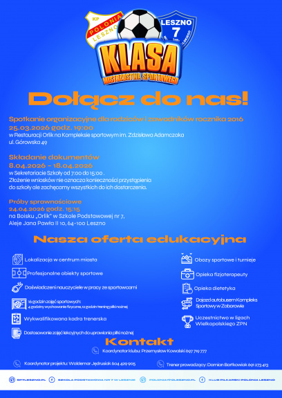 To świetna okazja, aby sprawdzić, czy ścieżka sportowo-edukacyjna w klasie Szkoły Mistrzostwa Sportowego będzie odpowiednia dla Państwa dziecka. Serdecznie zapraszamy wszystkich zainteresowanych rodziców oraz dzieci z rocznika 2016. Szczegółowe informacje dotyczące terminu i miejsca spotkania organizacyjnego zostaną przekazane w komunikatach szkoły. Niech to będzie pierwszy krok do sportowej przygody i rozwijania pasji już od najmłodszych lat! Ważne daty: Składanie wniosków - 8-18.04.2026 w sekretariacie szkoły od 7.00 do 15.00. Złożenie wniosków nie oznacza konieczności przystąpienia do szkoły, ale zachęcamy wszystkich do ich dostarczenia. Próby sprawnościowe - 24.04.2026 godz. 15.15 na Boisku Orlik w Szkole Podstawowej nr 7, Aleje Jana Pawła II 10, 64-100 Leszno. Nabór uzupełniający składanie wniosków 1-7.07.2026 próby sprawnościowe 9-13.07.2026 | ||