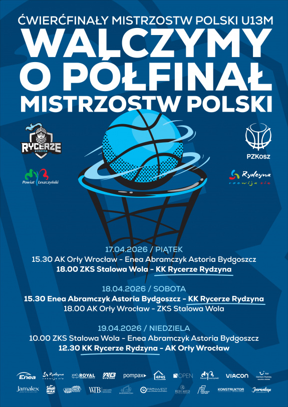 Dyżurny reporter: 667 70 70 60 Rycerze zmierzą się z wymagającymi przeciwnikami: AK Orły Wrocław, Enea Abramczyk Astoria Bydgoszcz oraz Stal Stalowa Wola. Do kolejnego etapu awansują dwie najlepsze drużyny turnieju, co zapowiada niezwykle zaciętą rywalizację. Droga do ćwierćfinału była dla młodych koszykarzy z Rydzyny długa i wymagająca. W rozgrywkach województwa wielkopolskiego drużyna zajęła wysokie, drugie miejsce, które dało przepustkę do dalszego etapu - rozgrywek strefowych. Tam Rycerze rywalizowali z zespołami z województwa zachodniopomorskiego, udowadniając swoją wartość. W całym sezonie zespół rozegrał 20 spotkań, z których aż 14 zakończył zwycięsko, ponosząc jedynie 6 porażek. Należy dodać iż całym sezonie drużyna doznała zaledwie dwóch porażek we własnej hali. Na sukces drużyny pracuje sztab szkoleniowy z trenerem Robertem Przybylakiem na czele, który prowadzi zespół już od czterech lat. W pracy wspiera go asystent Kamil Zywert. Zawodnicy na co dzień uczęszczają do klas sportowych w Szkole Podstawowej w Rydzynie, a ich systematyczne treningi - średnio 1,5 godziny dziennie, przynoszą znakomite efekty, czego dowodem jest udział w ćwierćfinale Mistrzostw Polski. Turniej rozpocznie się w piątek i już pierwszego dnia kibice będą świadkami dwóch spotkań: Piątek: AK Orły Wrocław - Enea Abramczyk Astoria Bydgoszcz (15:30) Rycerze Rydzyna - Stal Stalowa Wola (18:00) Sobota (18.04): Enea Abramczyk Astoria Bydgoszcz - Rycerze Rydzyna (15:30) AK Orły Wrocław - Stal Stalowa Wola (18:00) Niedziela (19.04): Stal Stalowa Wola - Enea Abramczyk Astoria Bydgoszcz (10:00) Rycerze Rydzyna - AK Orły Wrocław (12:30) Zapowiadając sportowe emocje, warto również wspomnieć o drużynie dziewcząt U13 z Rycerzy Rydzyna. ![]() Klub Rycerze Rydzyna serdecznie zaprasza wszystkich kibiców do hali w Rydzynie.