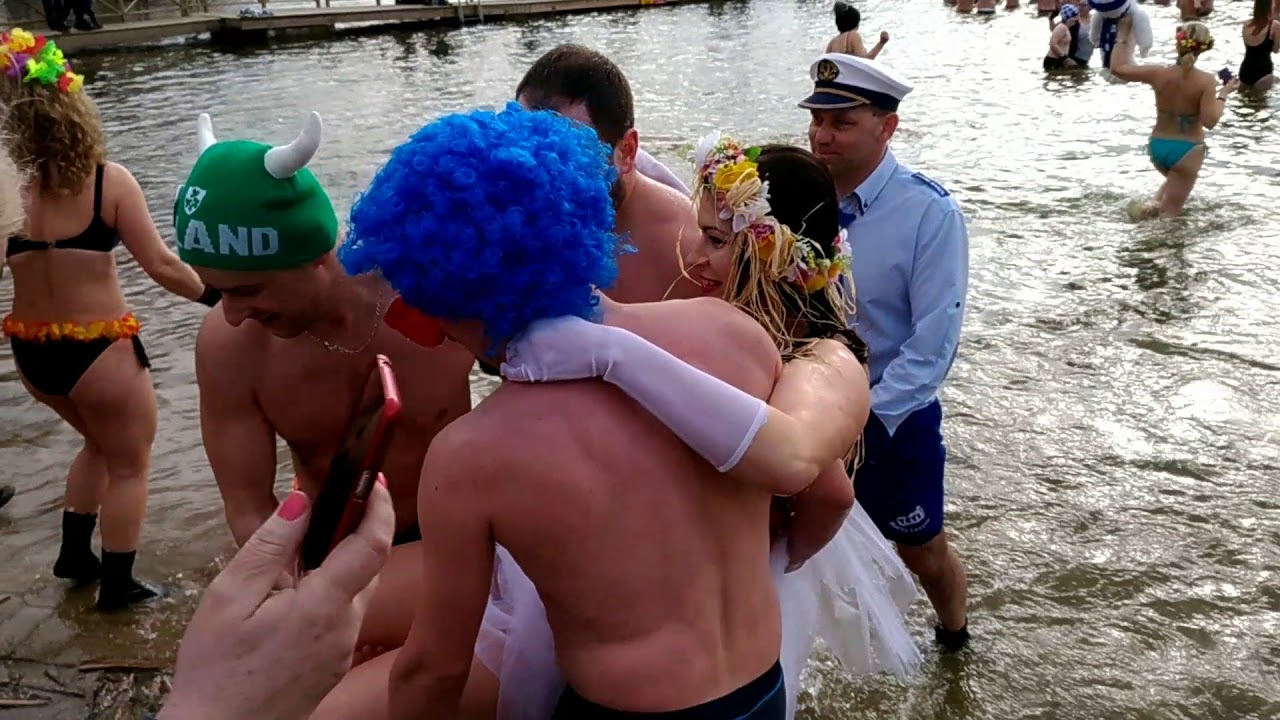 Wejście do wody poprzedziła tradycyjna rozgrzewka. Gdy Marzanna wskoczyła z pomostu do jeziora, morsy natychmiast ruszyły na ratunek.