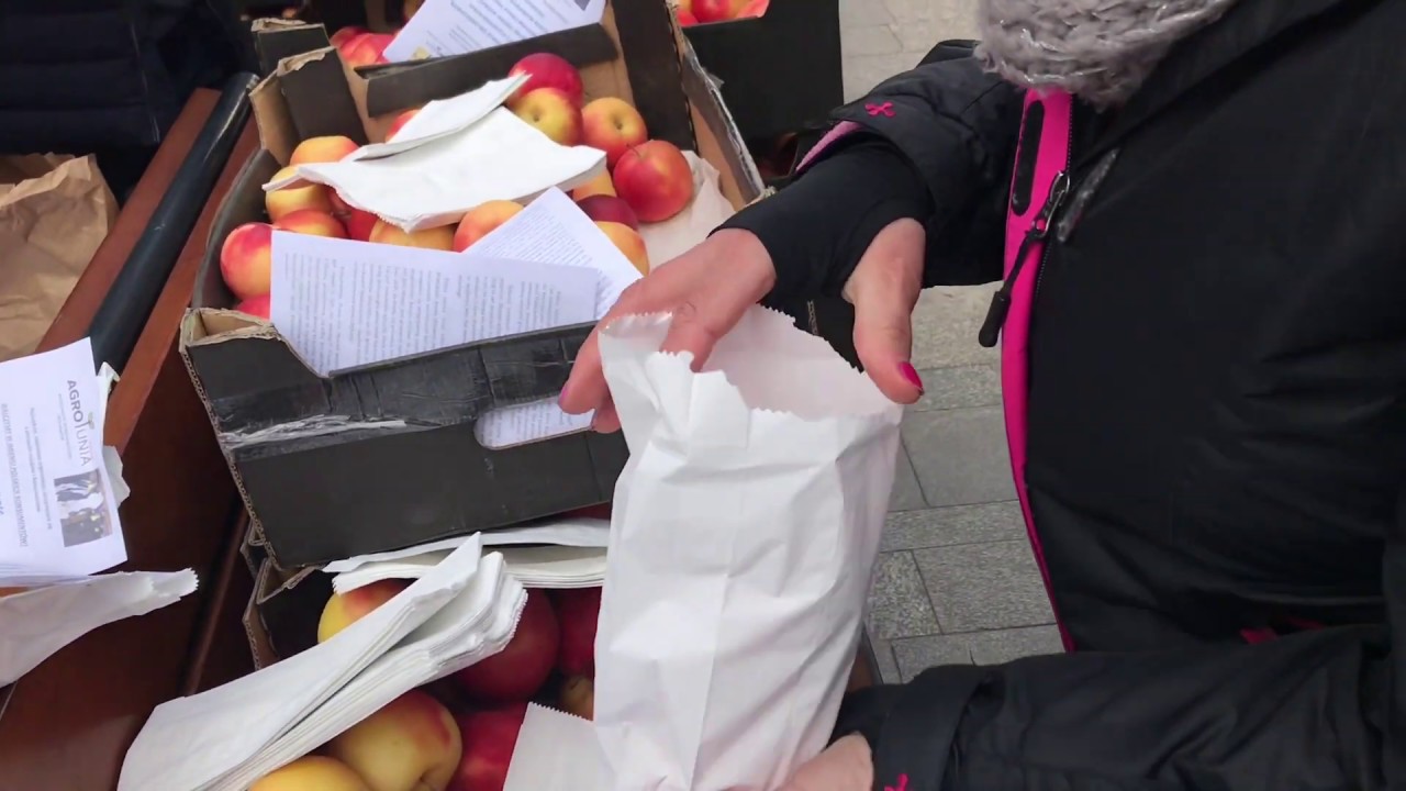 Blisko 300 kg jabłek rozdali na ulicy Słowiańskiej rolnicy zrzeszeni w Agrounii. W ten sposób chcieli zwrócić uwagę mieszkańców na problemy z jakimi się zmagają. Do przygotowanych paczek z jabłkami dołączona była broszurka, informująca o trudnej sytuacji na rynku rolniczym. - Chcemy pokazać, że walcząc o sprawy własnych gospodarstw, walczymy również o interes konsumentów - mówili.