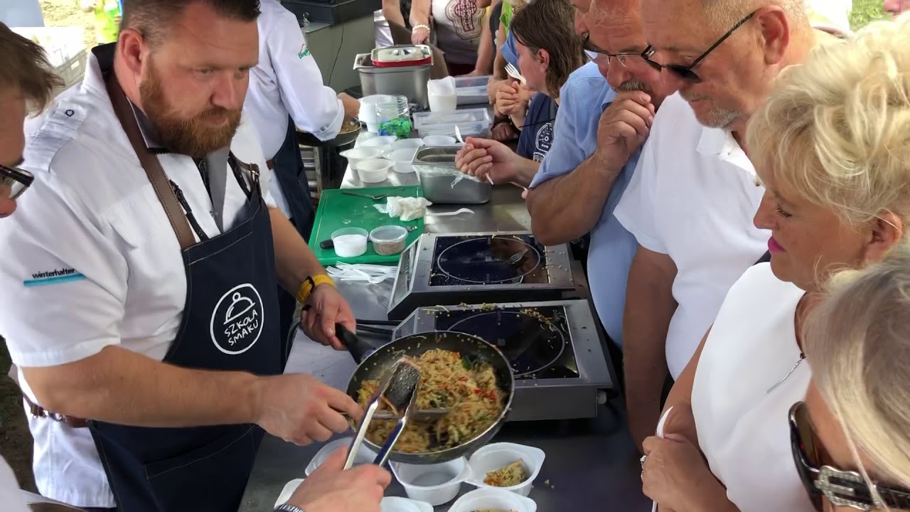 lub podwieczorek. Było w czym wybierać. Półfinalista programu Top Chef, Dawid Łagowski wspólnie z właścicielem Restauracji Grodzka 12 w Lesznie, Waldemarem Kaniewskim przygotowali łososia z warzywami oraz pyzy nadziewane szarpaną wieprzowiną i czerninę. - Jesteśmy w Wielkopolsce więc pyzy musiały być. Wydaliśmy setki porcji - powiedział W.Kaniewski. Dawid Łagowski podpowiadał jak przyrządzić dobrego łososia i zwracał uwagę, że 70% sukcesu w gotowaniu zależy od jakości produktu.