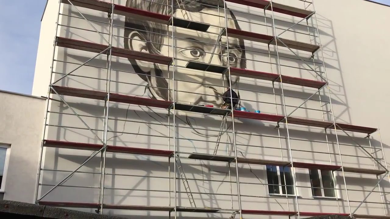 - To jest moja adaptacja portretu, wykonanego przez anonimowego autora - mówi wykonawca Łukasz Grobelny - Mural będzie zajmował około 140 metrów kwadratowych powierzchni. Wykonywany jest za pomocą elewacyjnych farb silikonowych, bo stawiam na trwałość i estetykę - podkreśla.
