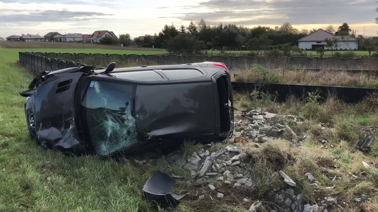 aby zrobić krótki postój. W aucie podróżowało pięć osób, w tym dwoje dzieci. Kierowca co jakiś czas zwalniał, aż w końcu zatrzymał się na jezdni. Wtedy na manewr wyprzedzania zdecydował się jadący za nim kierowca peugeota. W tym momencie tiguan wyjechał delikatnie na przeciwległy pas i uderzył w tylne drzwi wyprzedzającego go peugeota. Kierowca stracił panowanie nad autem, wypadł z drogi i wjechał w betonowe ogrodzenie. Jego pojazd przewrócił się na bok. W samochodzie podróżował z partnerką oraz psem. Kobieta najprawdopodobniej doznała urazu barku. Na miejsce została wezwana karetka pogotowia.