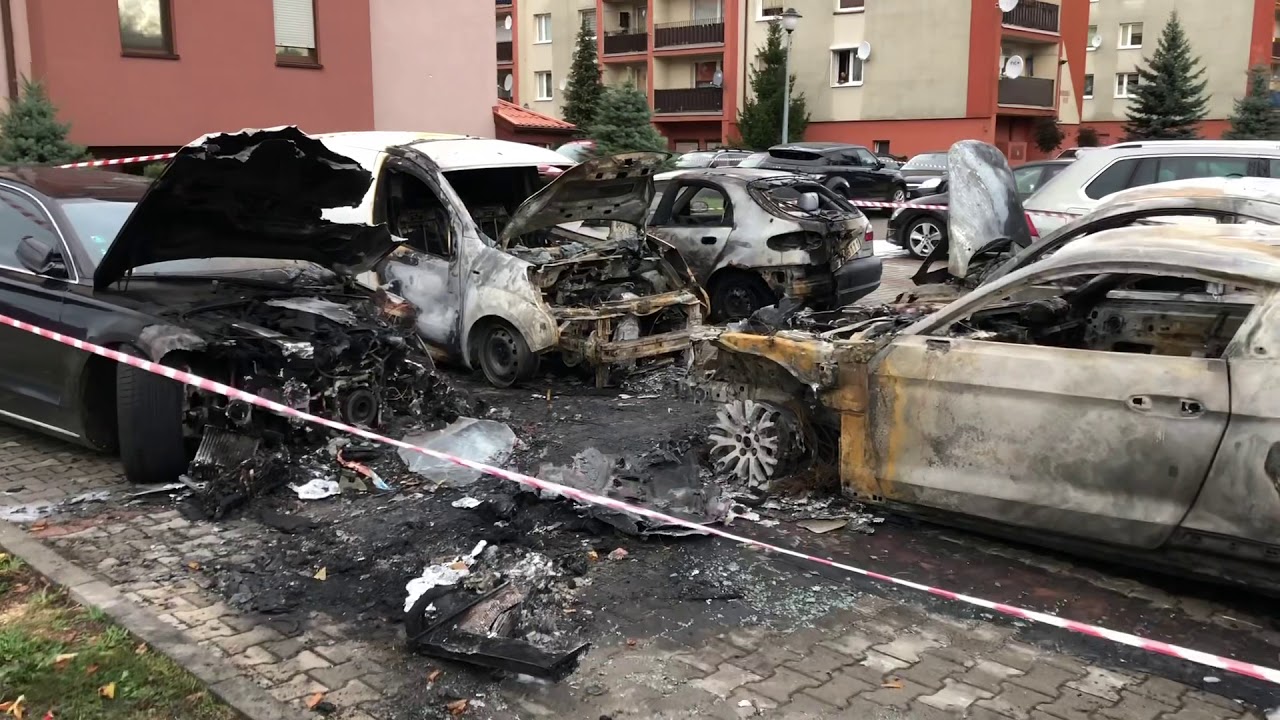 spalone są mustang, volkswagen oraz volvo. Pozostałe auta są nadpalone. - Zaparkowałem tutaj dwa moje samochody. W nocy obudzili mnie sąsiedzi, z mojego volvo już nic nie zostało, drugi samochód, volkswagen tiguan, też jest uszkodzony. Widok jest przerażający - powiedział jeden z poszkodowanych właścicieli.