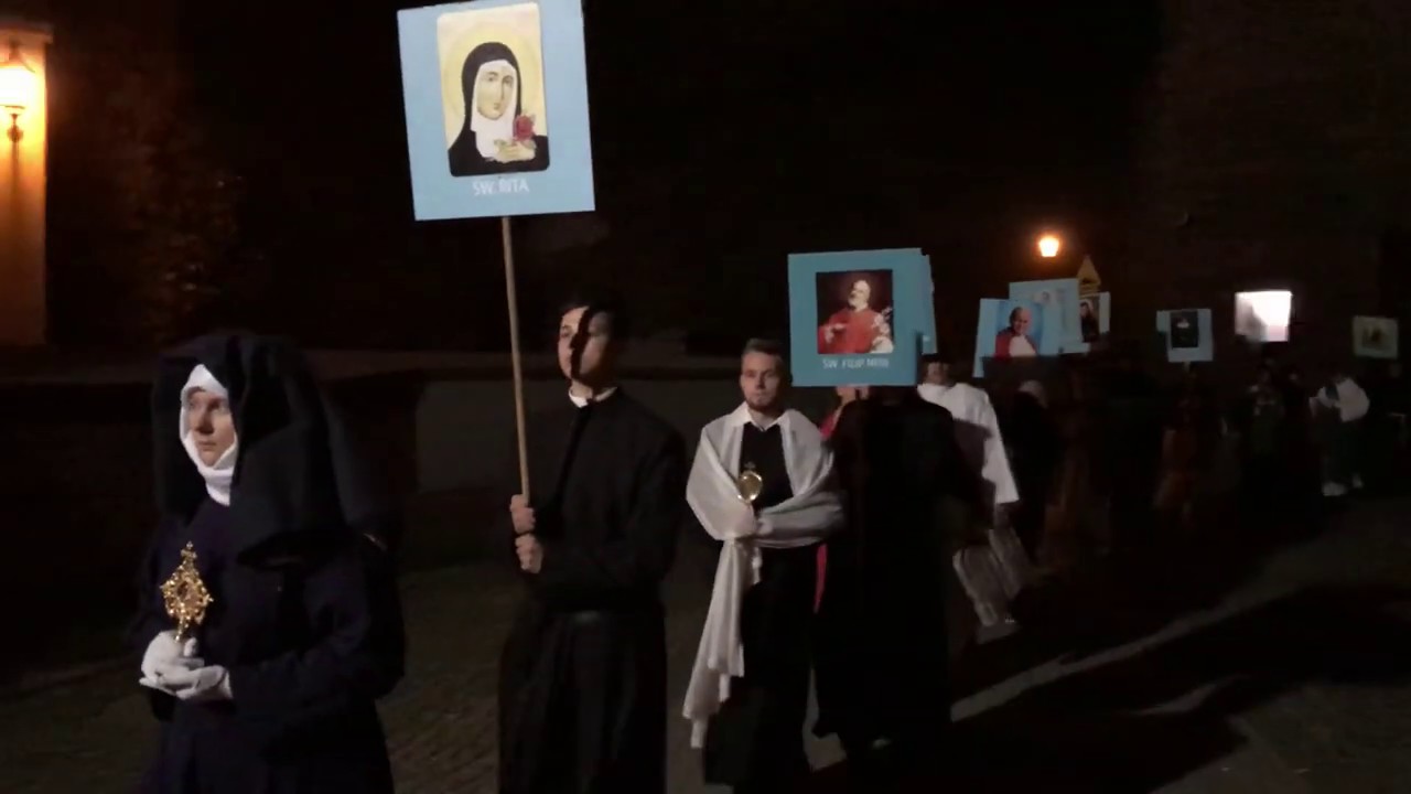 Podczas pochodu była muzyka i śpiew. Niektórzy przebrali się w stroje świętych. - Mam strój świętej Teresy, bo to jest moja imienniczka i patronka - mówiła uczestniczka marszu. - Jesteśmy tradycjonalistami, dlatego wolimy Holy Wins, a nie Halloween, tradycje, które nie są do końca nasze - dodaje inna. Pochód zatrzymał się przy gostyńskim cmentarzu, aby wspólnie pomodlić się za wszystkich zmarłych. Po dotarciu na Świętą Górę, odbyła się msza.