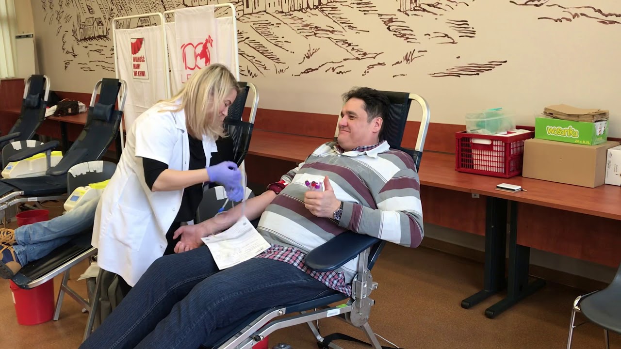 krwiodawców. Większość, przynajmniej tych których spotkaliśmy na miejscu, ma już spore doświadczenie w oddawaniu krwi, samo badanie, a następnie kłucie igłami więc ich nie stresowało. -Mamy z mężem oddane po 30 litrów, ale pierwszy raz robimy to w takim miejscu - powiedziała jedna z uczestniczek akcji. Zbiórka potrwa dziś do 13.00 - każdy, kto odda krew otrzyma, poza zwyczajowymi czekoladami, przypinkę wydaną z okazji jubileuszu 100-lecia.