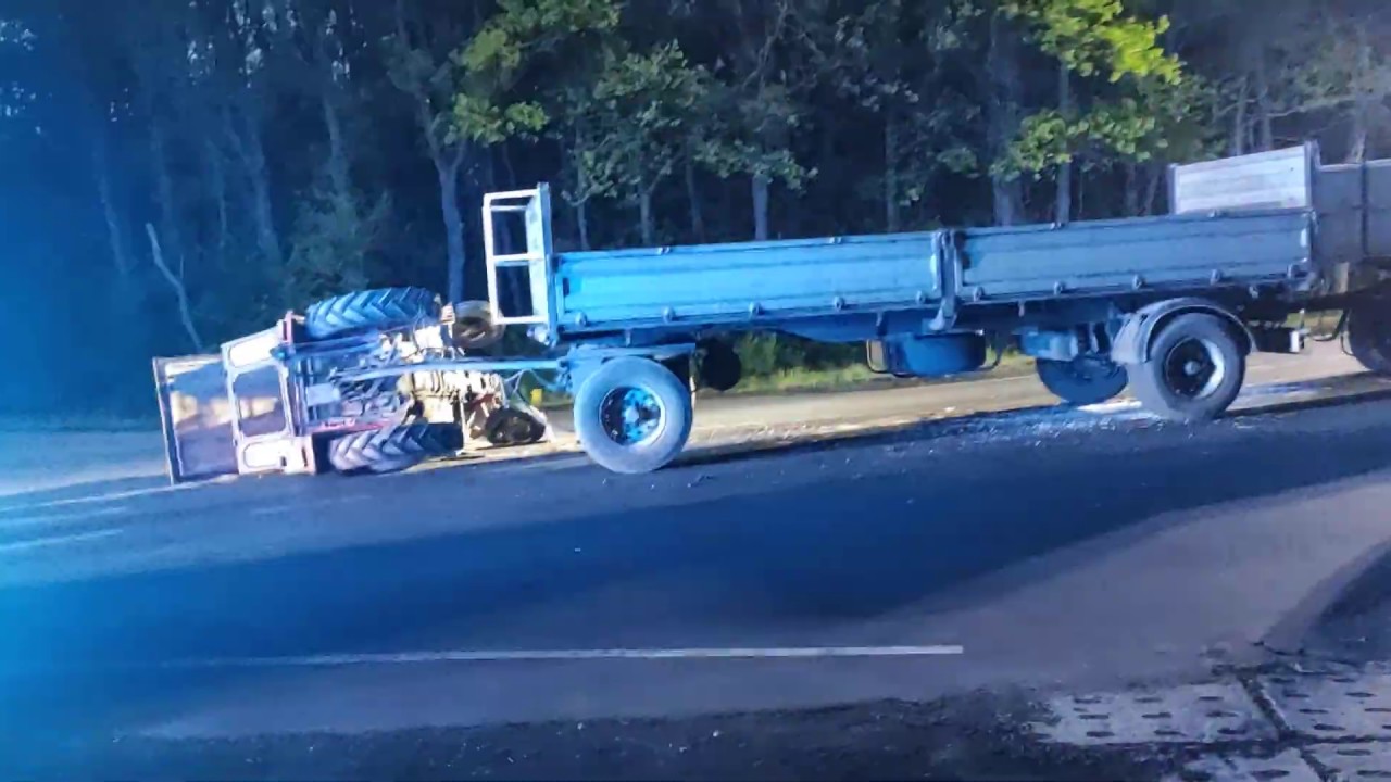 Z nieoficjalnych informacji wynika, że kierowca ciągnika rolniczego nagle zjechał na lewy pas, by rozpocząć manewr skrętu w prawo, w stronę Dobramyśli. Po uderzeniu golfa traktor przewrócił się na bok. Poszkodowany został kierowca ciągnika, karetka zabrała go do szpitala. Badanie wykazało złamanie łopatki i żeber. Nic poważnego nie stało się kierowcy oraz pasażerom golfa.